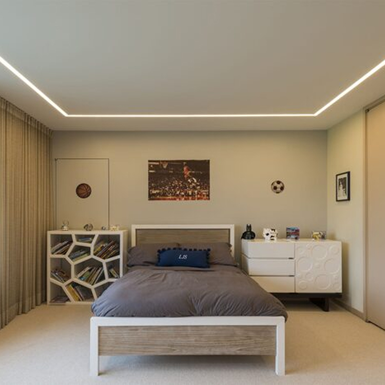 Лаконичный матовый потолок с аккуратной контурной подсветкой по периметру.